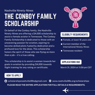 The Nashville Ninety-Nines, on behalf of the Conboy family, offer a $4,000 scholarship for female aviators in Tennessee. The Conboy Family Scholarship supports women with a strong passion for aviation, providing funds for flight training, applicable to any rating or certificate.