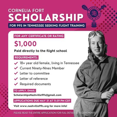 The Nashville Ninety-Nines offer the Cornelia Fort Scholarship in honor of the pioneering aviator, Cornelia Clark Fort. This $1,000 scholarship supports women pursuing a career in aviation by providing funds for flight training, applicable to any rating or certificate.