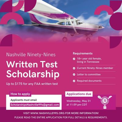 The Nashville Ninety-Nines offer the Written Test Scholarship, a $175 award supporting female pilots in pursuing their aviation goals by covering the cost of any FAA written test.